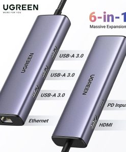 Bộ chuyển USB-C 6 in 1 Ugreen 15598 CM512, HDMI 4K@30Hz + 3x USB 3.0 + Lan 1Gbps + PD100W