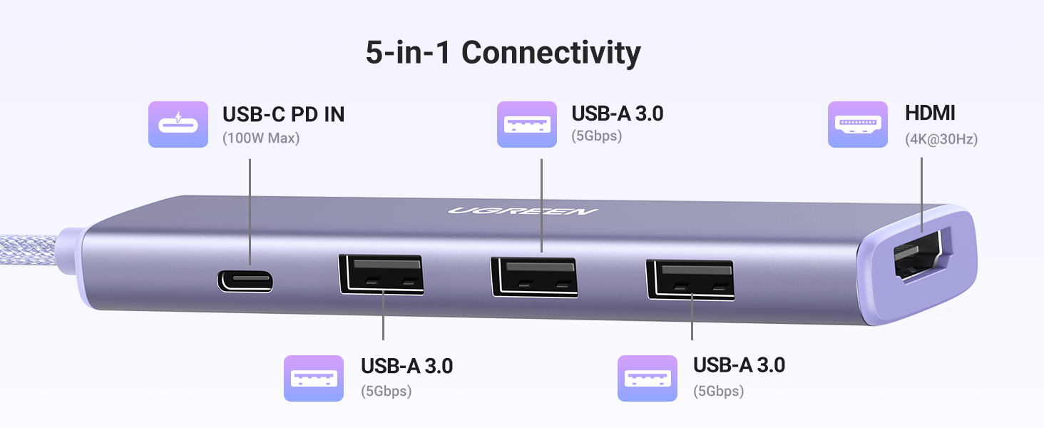 USB-C Hub 5 trong 1 Ugreen 35582 CM478 HDMI 4K, PD 100W, 3 x USB A 3.0 5Gbps cho MacBook Pro/Air, iPad Pro, iMac, iPhone 15 Pro/Pro Max, XPS, Thinkpad..